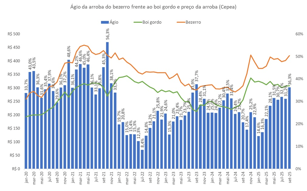 O ágio do bezerro frente ao boi gordo de 36,3% na parcial de setembro de 2025 alcançou o maior valor do ano e também desde setembro de 2023.