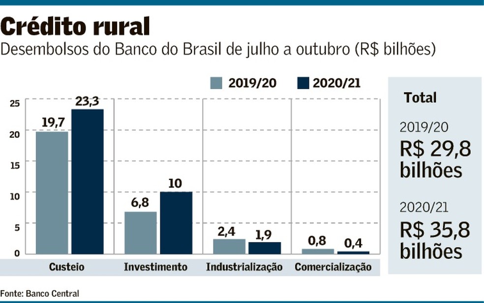 Na safra 2019/20, dos R$ 190,3 bilhões emprestados aos produtores pelo sistema financeiro, R$ 81,1 saíram do BB. Nos quatro primeiros meses desta safra, as contratações subiram 20% em relação ao mesmo período do ciclo 2019/20, para R$ 35,8 bilhões – puxadas pelos investimentos, que aumentaram quase 50%, para R$ 10 bilhões. O número não contempla informações de títulos, como CPR e CDCA, e crédito para giro e agroindustrial.