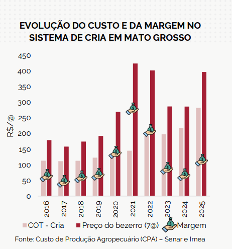 O custo de produção da cria do gado corte registrou forte alta em 2025, mas foi superado pela expressiva valorização do bezerro. É o que apontam os dados coletados em Mato Grosso pelo projeto de Custo de Produção Agropecuário (CPA), do Senar, em parceria com o Instituto Mato-Grossense de Economia Agropecuária (Imea).