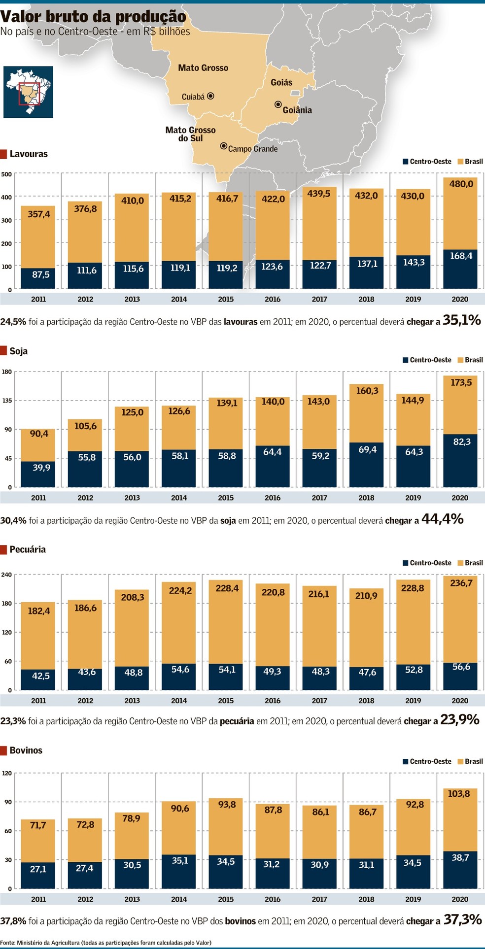 Dados do Ministério da Agricultura, puxado pelos grãos, o VBP das lavouras de Mato Grosso, Goiás, Mato Grosso do Sul e do Distrito Federal (a conta inclui 21 produtos) deverá somar R$ 168,4 bilhões neste ano, 17,5% mais que em 2019. Em relação ao resultado de 2011, o aumento é de 92,5%, ou R$ 80,9 bilhões.
