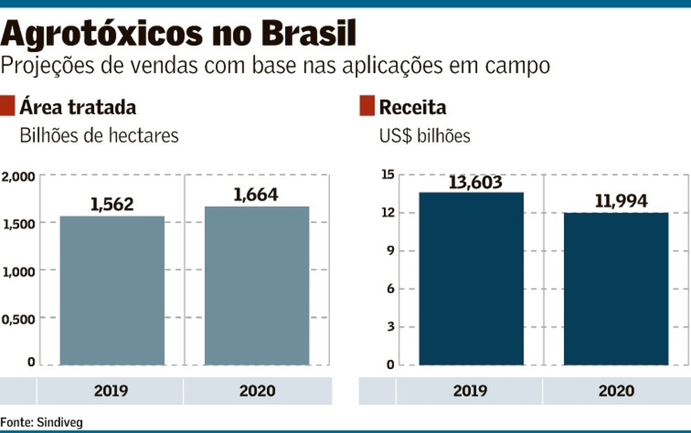 A área tratada com os produtos, de qualquer forma, deverá ser 6,5% maior em 2020 do que foi no ano passado e chegar a 1,664 bilhão de hectares. O resultado é puxado pela ampliação do plantio da soja (3,4%), do milho (4%) e do algodão (3%) e pela pressão de pragas, doenças e ervas daninhas, que tornam indispensáveis no manejo.
